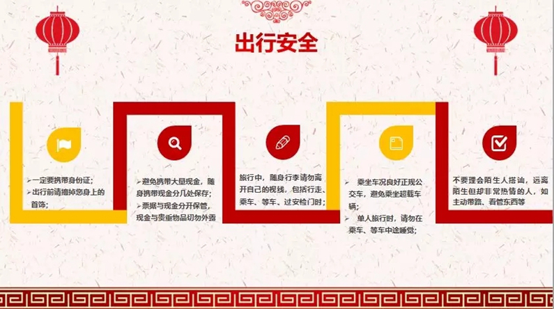 出门钱财不显眼,可放在衣内口袋里,并扣好钮扣和拉链 小心开车,谨慎慢行 安全乘车,看好行李物品 小心公共场所财务安全