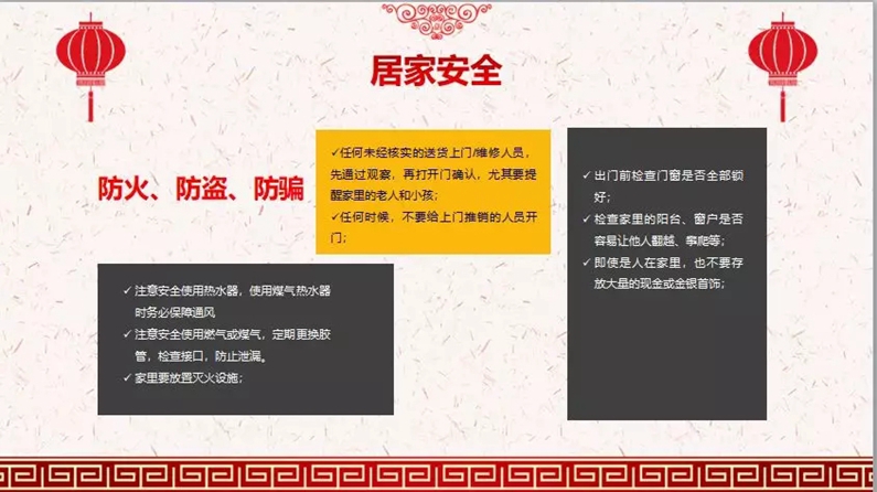 居家安全 合理饮食,适量饮酒,谨防食物中毒 安全燃放烟花爆竹 注意居家防火、防电 谨防燃气泄漏,小心火灾